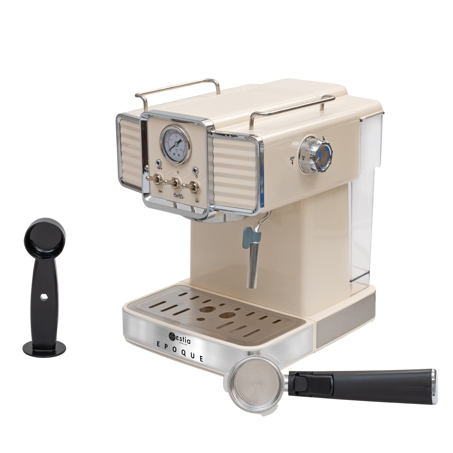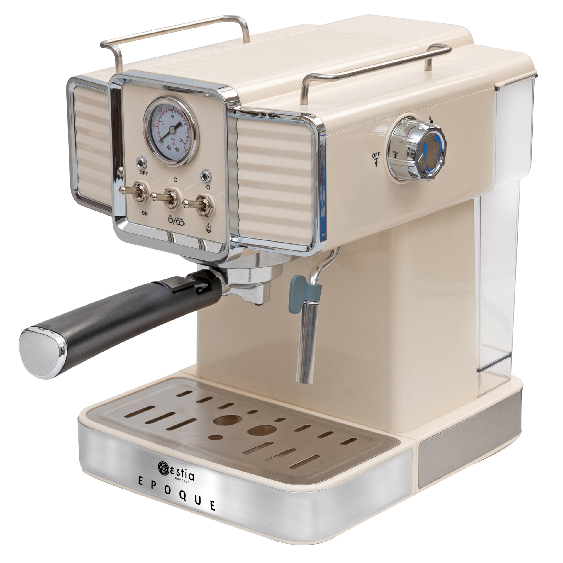 Η πρακτικότητα και το στυλ συνδυάζονται για να κάνουν κάθε κουζίνα να ξεχωρίσει! Η μηχανή espresso Epoque με μοτέρ 1350W και αντλία 20 bar παρασκευάζει espresso με μοναδική κρέμα σε κάθε χρήση. Διαθέτει πρακτικά κουμπιά ενεργοποίησης, εκχύλισης καφέ και λειτουργίας ατμού που την καθιστούν εύκολη στη χρήση και μετρητή bar με ένδειξη πίεσης. Με ακροφύσιο και πλήκτρο ρύθμισης ροής ατμού για αφρόγαλα και ζέσταμα νερού ή γάλατος. Συνδυάστε την μηχανή espresso με την φρυγανιέρα και τον βραστήρα της Estia Home Art Epoque Series και δώστε retro διάθεση στο χώρο σας!